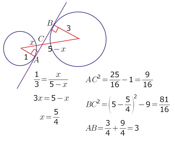 1. Расстояние между центрами двух окружностей радиусов 3 и 1 равно 5. Найдите длину отрезка общей внутриней касательной этих окружностей.