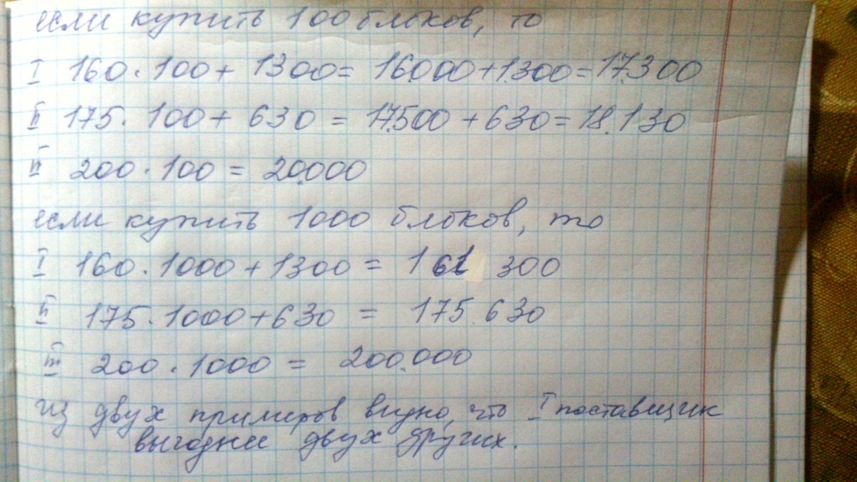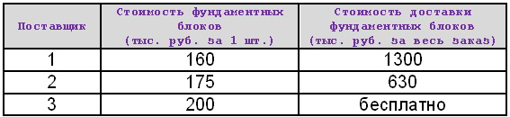 Строительная бригада планирует заказать фундаментные блоки у одного из трёх поставщиков. Стоимость блоков и их доставки указана в таблице. При покупке какого количества блоков самыми выгодными будут условия второго поставщика?