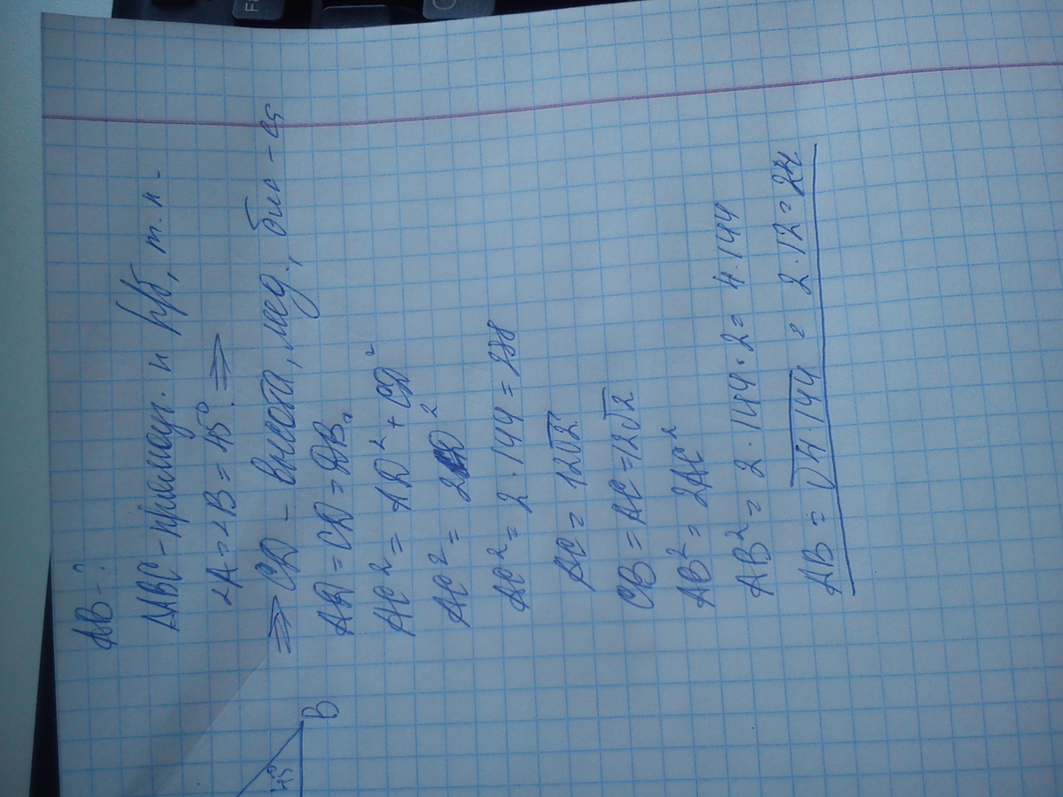 Плиииз!!! Отрезок CD - высота треугольника ABC, в котором угол ACB = 90°, угол B = 45°. Найдите сторону AB, если CD = 12 см.