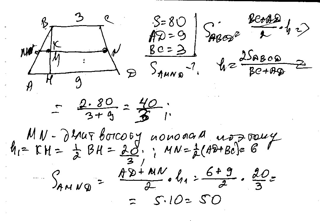 В трапеции abcd: ad=9, bc=3 а ее площадь равна 80. Найти площадь трапеции BCNM,где MN - cредняя линия трапеции ABCD.