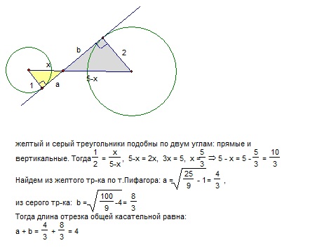 2.. Расстояние между центрами двух окружностей радиусов 3 и 1 равно 5. Найдите длину отрезка общей внутриней касательной этих окружностей.
