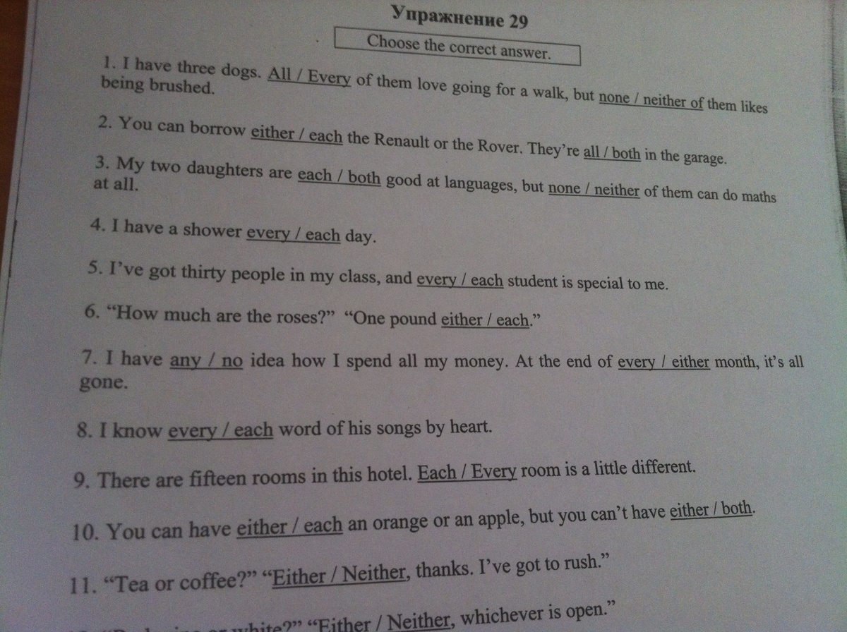 в 10 и 11 ответы справо,в 4 ответ слево,в 1 справо,every-любой(про неодуш предметы),each(про одушевлённые существа)-каждый