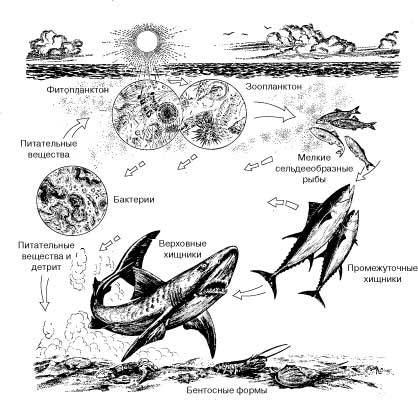 4. Промежуточные хищники, например, тунец (консумент 3 порядка) ------>