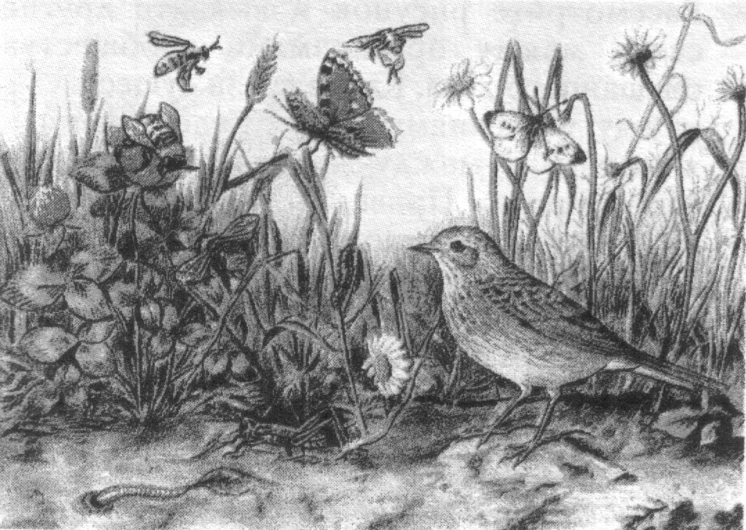дождевой червь, каменка, шмель, махаон(его гусеница), желтушка луговая, кузнечик, тля.