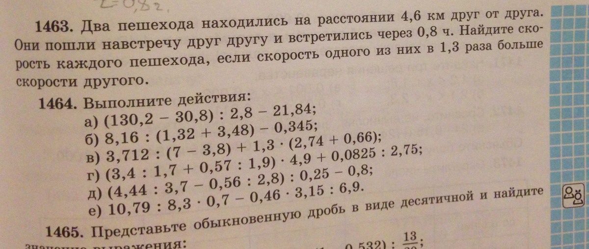 Пусть x будет скорость первого пешехода, тогда скорость второго пешехода равна 1.3x, зная что расстояние равно 4.6 км, а время их пути 0.8 ч. Составим и решим уравнение