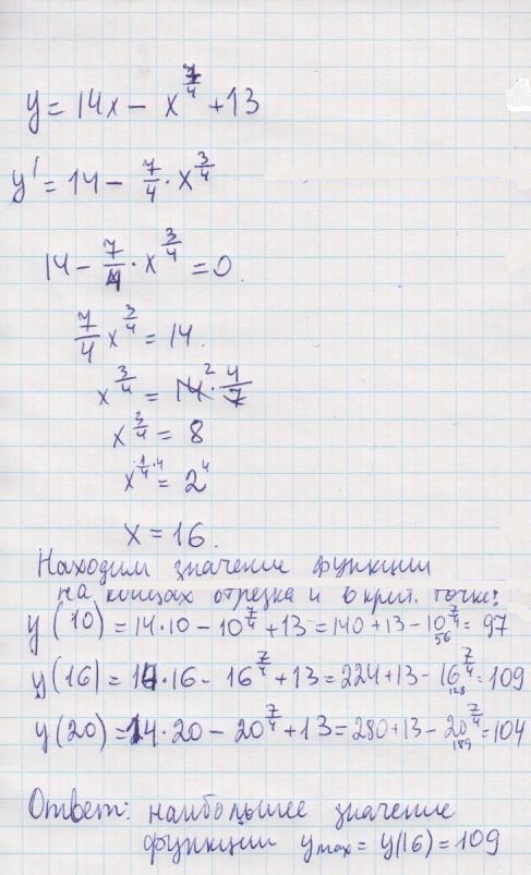 Найдите наибольшее значение функции y=14x-x*.....+13 на отрезке [10;20] (5 задание внутри)