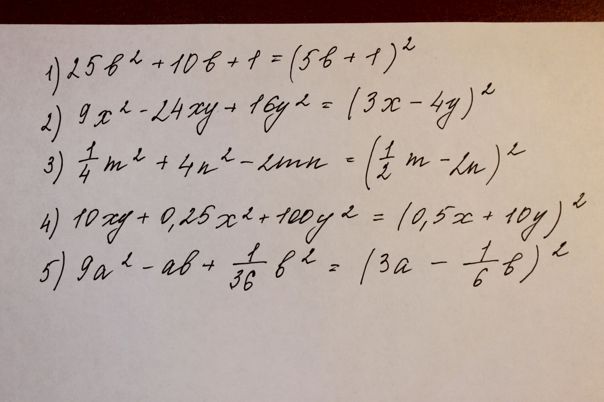 Во всех примерах используется одна и та же формула сокращенного умножения (a+b)^2=a^2+2ab+b^2. Ну и точно такая же, только с минусом (a-b)^2=a^2-2ab+b^2. Я думаю тебе не понятны 3,4,5 примеры. просто ты там меняешь последовательность и у тебя приходит все к стандартному виду.