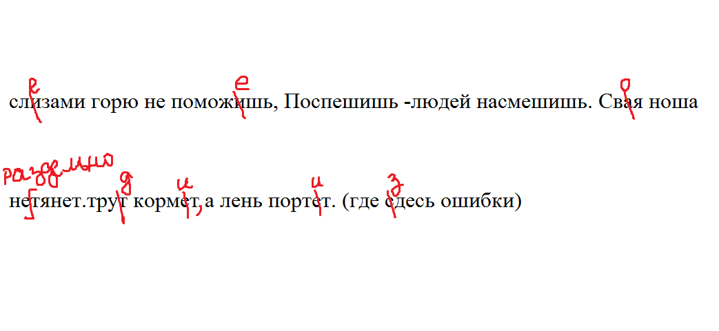 слизами горю не поможишь, Поспешишь -людей насмешишь. Свая ноша нетянет.трут кормет а лень портет. (где сдесь ошибки)