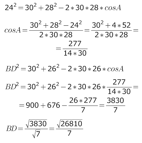 В треугольнике АВС АВ=30 см, ВС= 24 см, СА=28 см. На стороне АС выбрано точку D такую, что АD=26 см. Найдите BD.