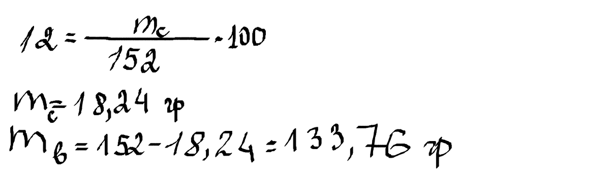 приготовили 152г раствора сульфата меди с массовой долей 12%. рассчитайте массу соли и массу воды, которая необходима для приготовления раствора.