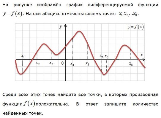 1 задание. В каждой из точек проводим касательную к графику функции, если эта касательная составляет с осью ох острый угол- производная положительна в данной точке, еси - тупой, то производная отрицательна.