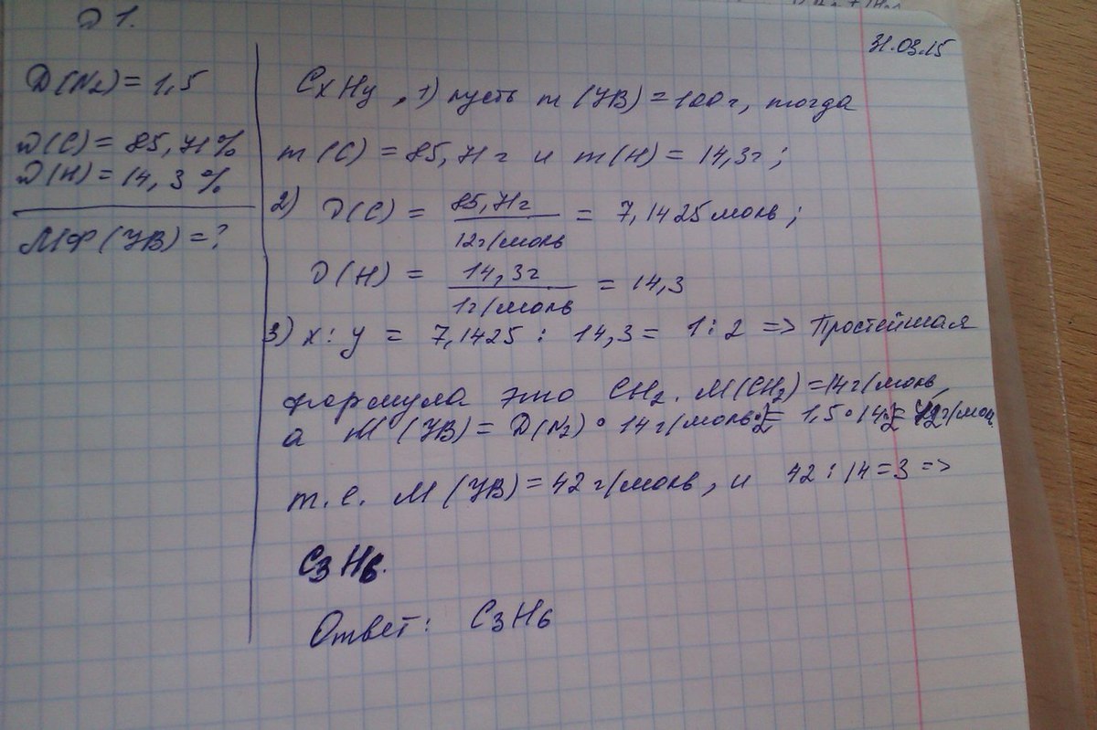 Углеводород имеет относительную плотность по азоту 1.5. Массовая доля углерода в нем составляет 85,71%, а водорода - 14,3%. Определите молекулярную формулу углеводорода.