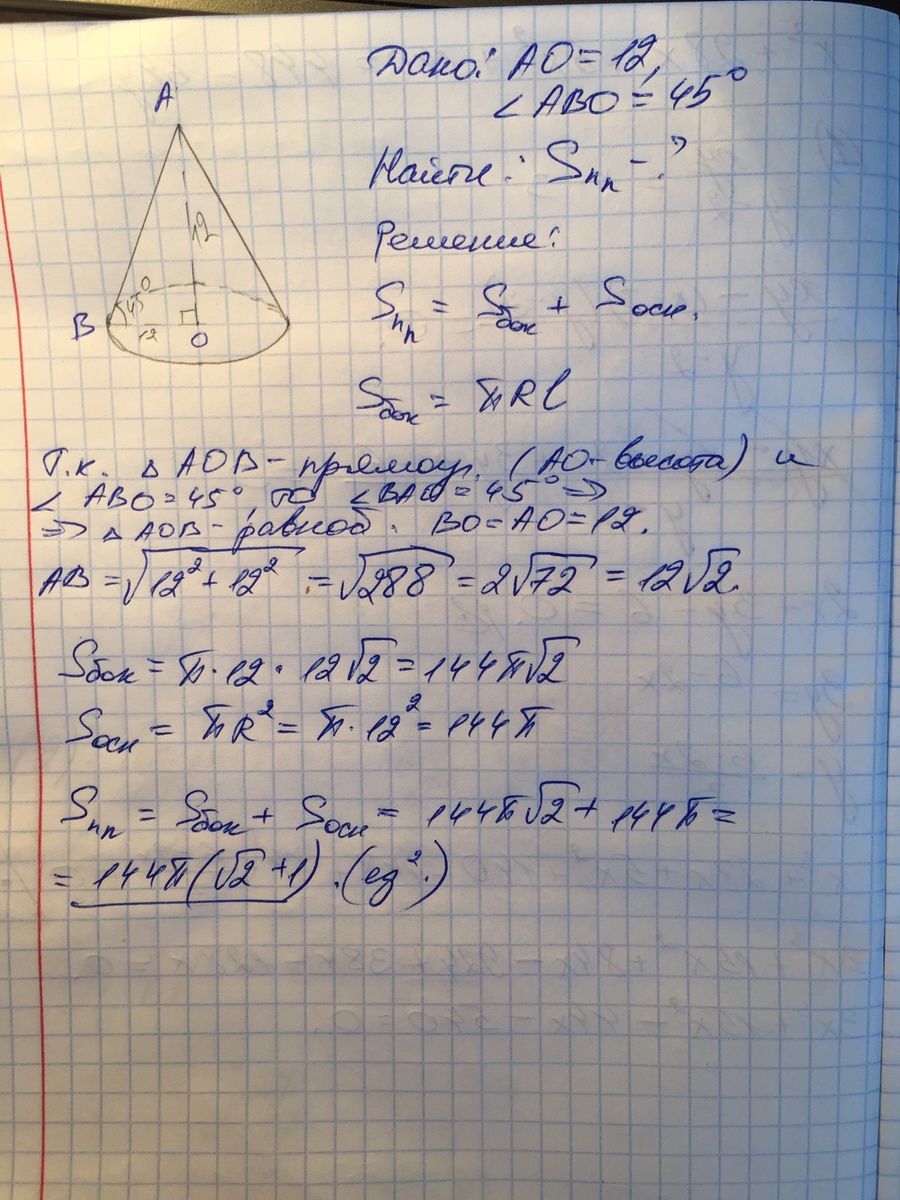 образующая конуса наклонена к плоскости основания под углом 45 градусов,а его высота равна12. найти площадь полной поверхности куба.