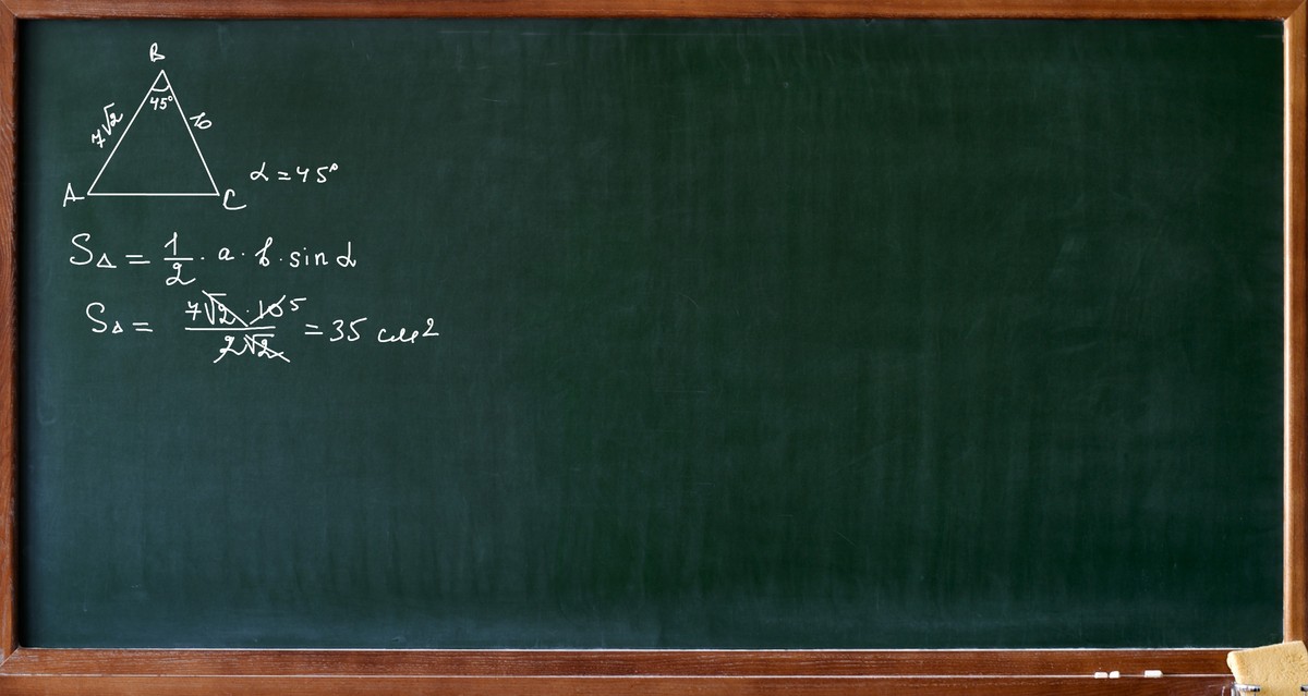Две стороны треугольника равны 7√2 и 10 см , а угол между ними равен 45° Найдите площадь треугольника.