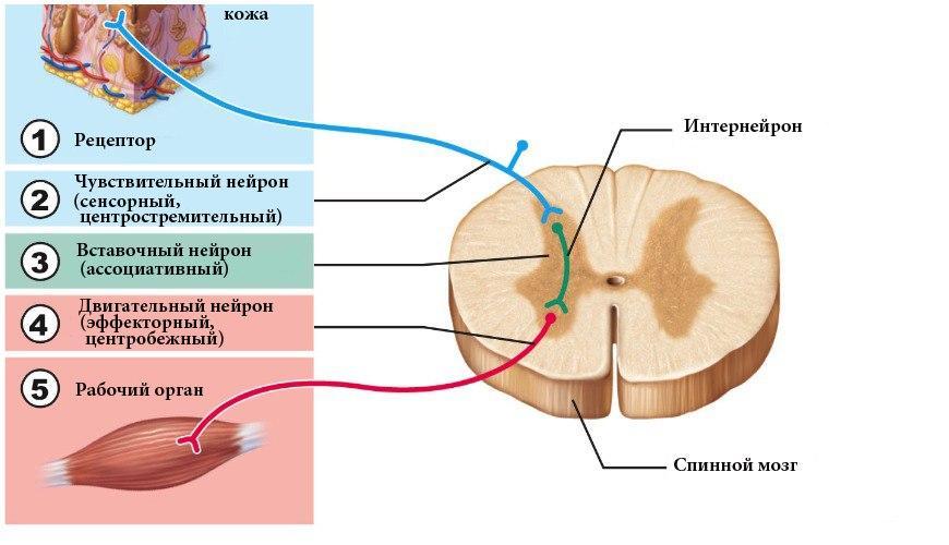 Рефлекс - это реакция организма в ответ на раздражение, выработанная с помощью нервной системы. В основе работы рефлекса лежит рефлекторная дуга, которая имеет следующие звенья: рецептор, чувствительный нейрон, отдел ЦНС (вставочный нейрон один или несколько), двигательного нейрона и органа ответчика (эффектора). Есть простейшие сухожильные рефлексы, в дуге которых отсутствует вставочный нейрон.