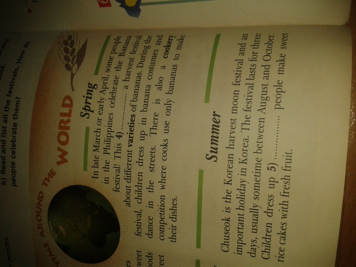 1. День благодарения - большой фестиваль в США и Канаде, чтобы праздновать урожай. Канадцы празднуют его в октябре, и американцы в ноябре. У некоторых городов есть парады, и у людей есть семейные обеды. Турция, соус бататов и клюквы и популярные продукты в этот день и всегда есть немного сладкого тыквенного пирога на десерт.