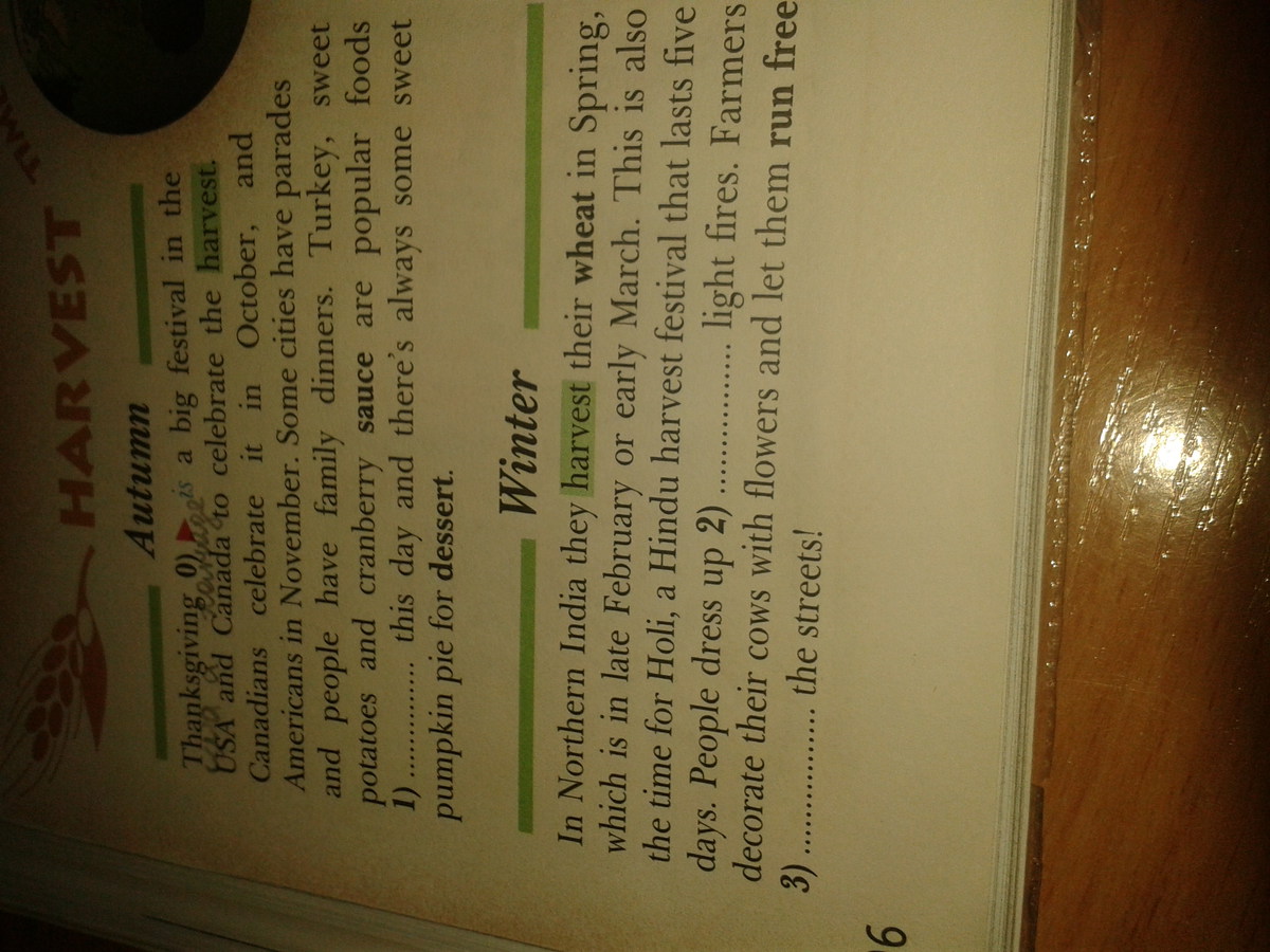 На севере Индии урожай пшеницы собирают весной, которая наступает в конце февраля или начале марта. В это время также проводится Холи, индийский праздник сбора урожая, который длится 5 дней. Люди наряжаются ...... зажигают огни. Фермеры украшают своих коров цветами и позволяют им спокойно гулять ......... по улицам.