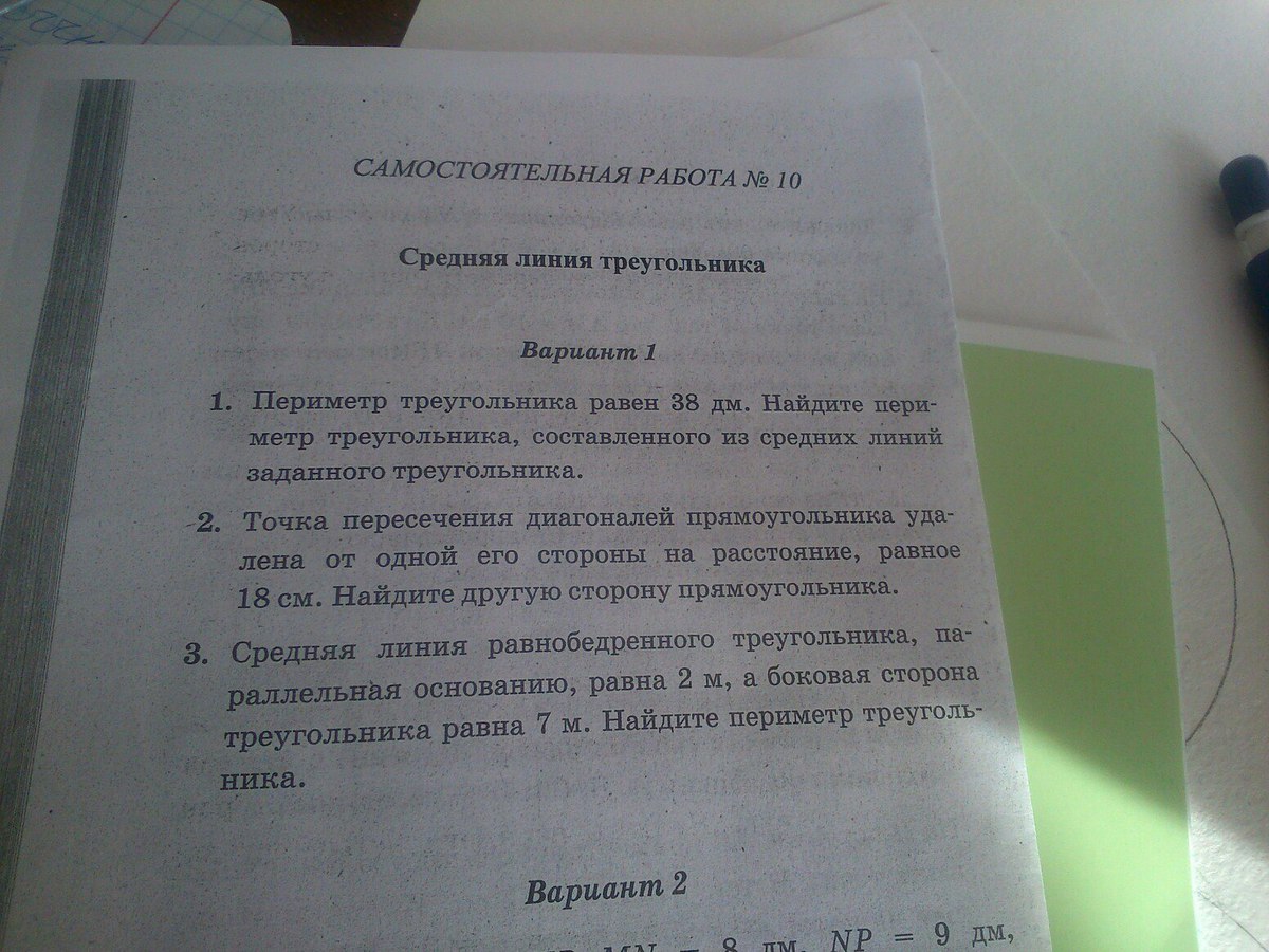 1) Средняя линия в треугольнике в два раза меньше той стороны, которой она параллельна. Следовательно, периметр треугольника, составленного из средних линий заданного будет равен 38/2 = 19 дм.