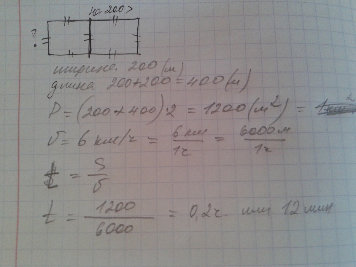 Длина участка прямоугольной формы на 200 метров больше ширины, причем ширина составляет одну вторую длинный. За какое время мальчик обойдется этот участок, если его скорость 6 километров в час? решите без х