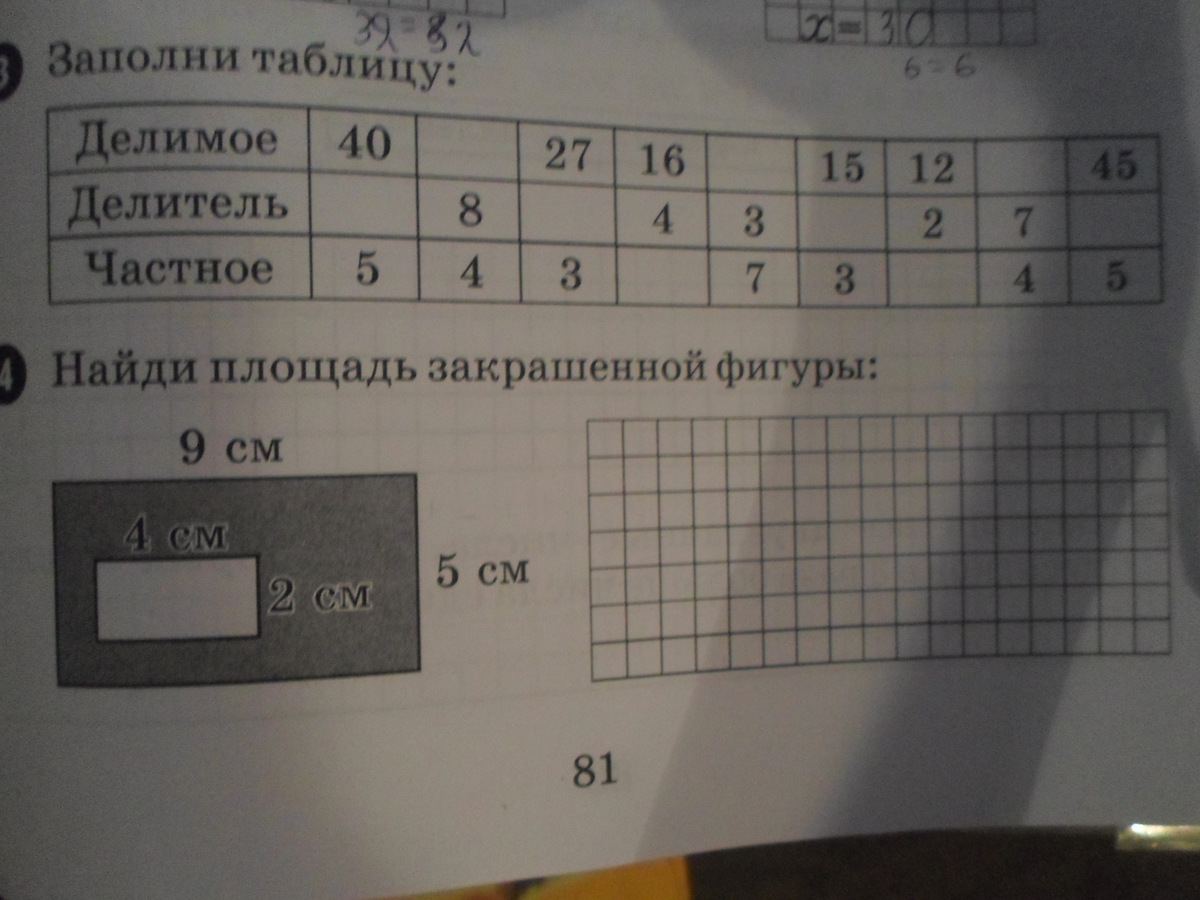2) 9*5 = 45 (см квадратных) - площадь закрашенной фигуры, если бы она была полностью закрашенной