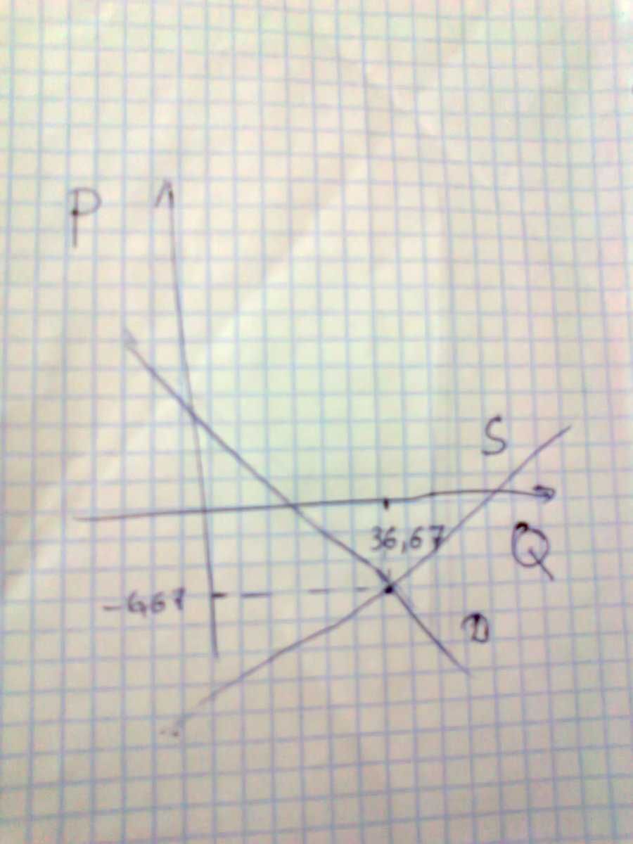 2. Построй оси координат, по оси ординат - P, по оси абцисс - Q. В этой точке (36,67; -6,67) пересекутся прямые D и S (спроса и предложения) . Отсутствует спрос на рынке.