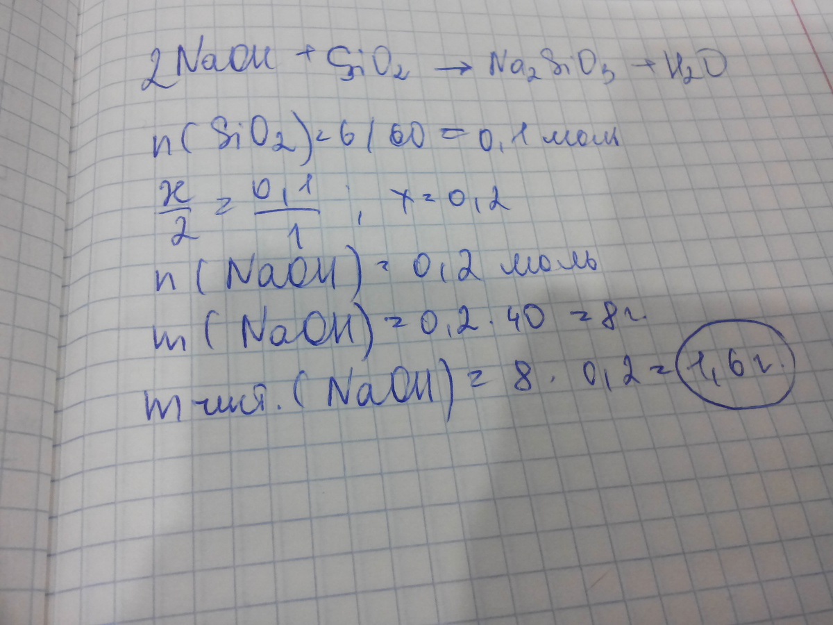 Вычислите массу 20%-ного раствора гидроксида натрия, в котором можно растворить 6 г оксида кремния(IV) .