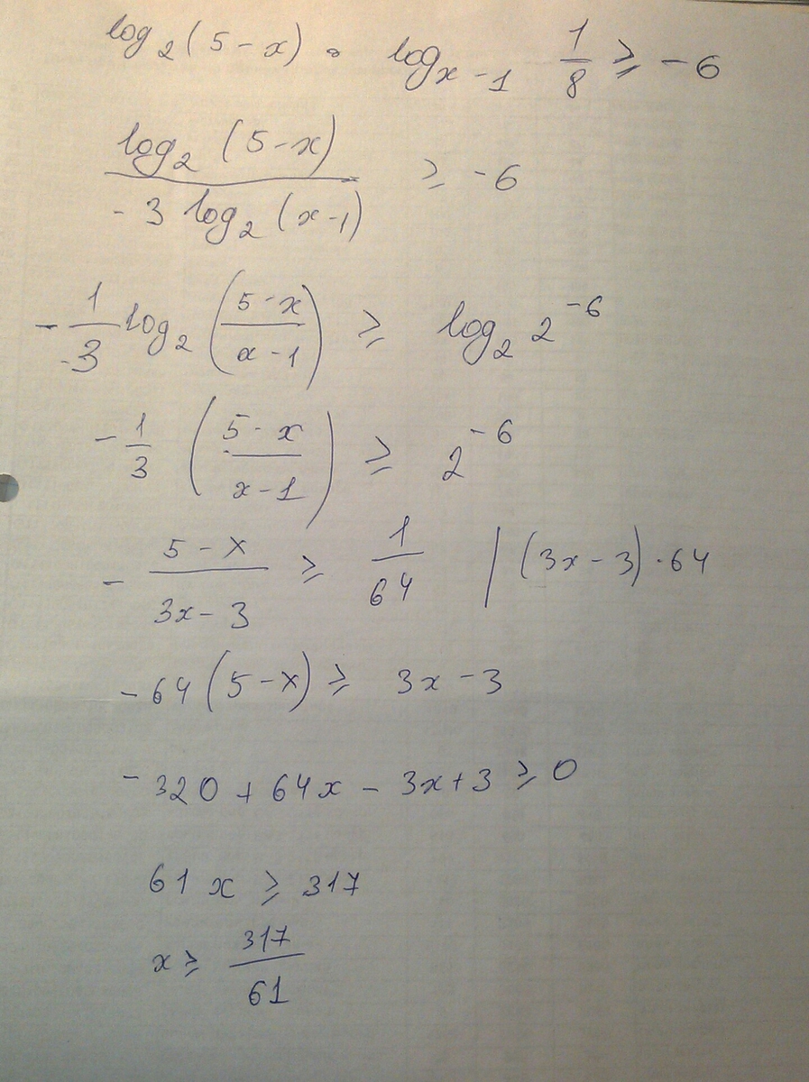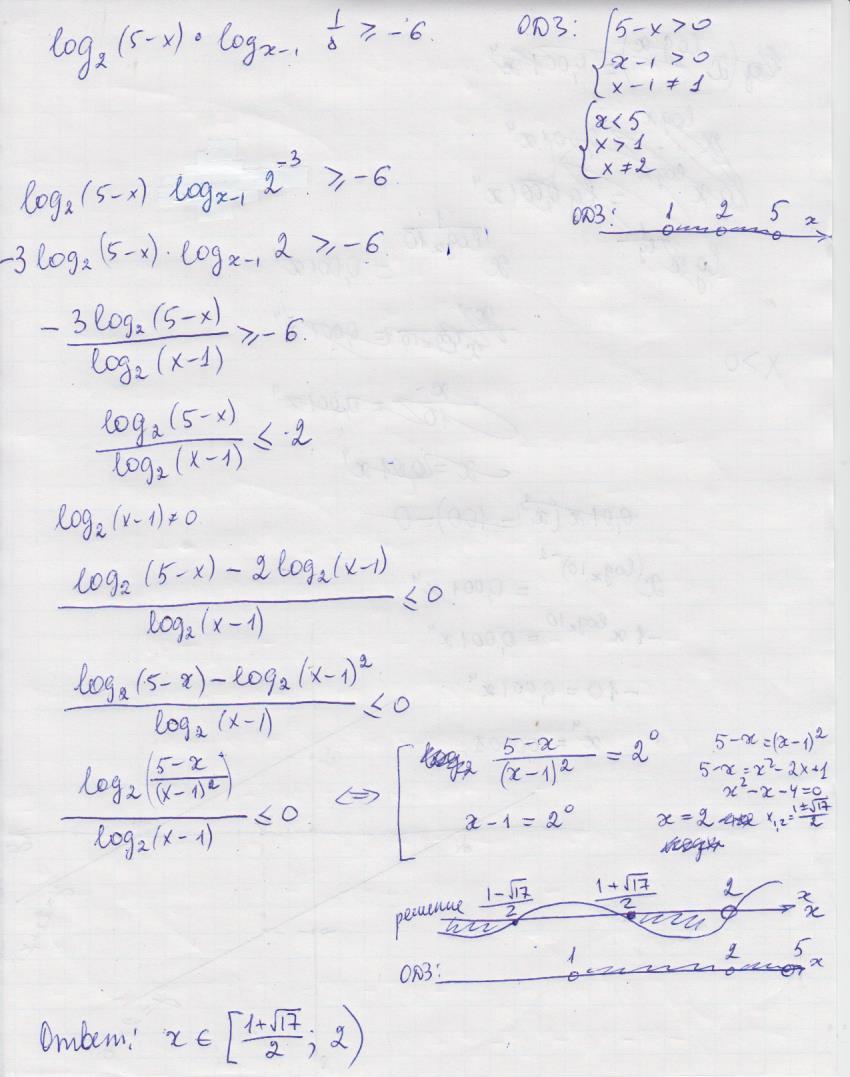 !!! Нарооод!! Помогите решить: log2 (5-x)*logx-1 1/8>-6(больше либо равно)