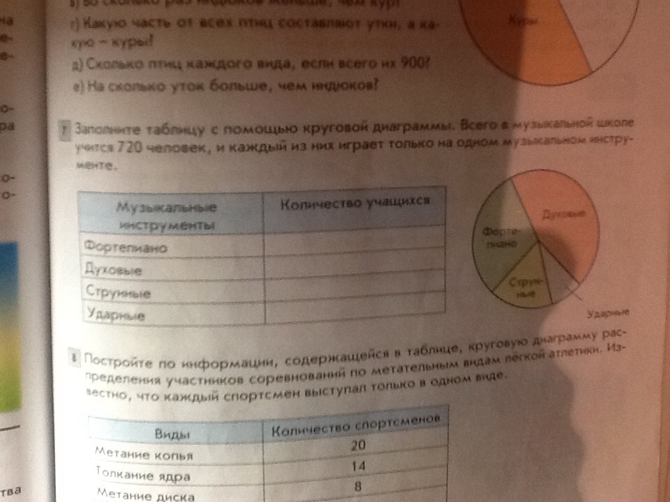Номер 7 .заполните таблицу с помощью круговой диаграммы . Всего в музыкальной школе учится 720.