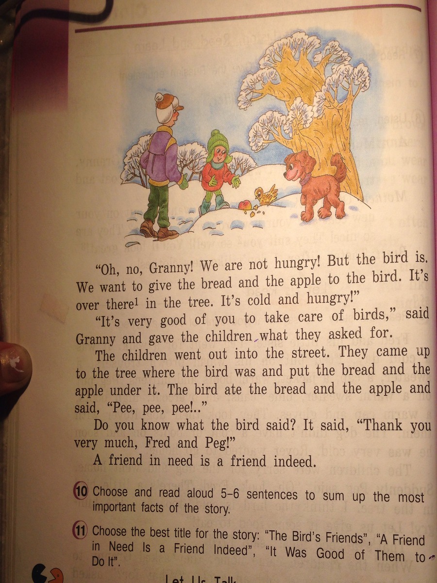 Детям было жалко собаку и они пошли домой. Вдруг Пеги сказала "О,посмотри,Фред!Там есть маленькая птичка в дереве.Я думаю птичке тоже холодно.И она голодная!Давай дадим ей немного еды!"