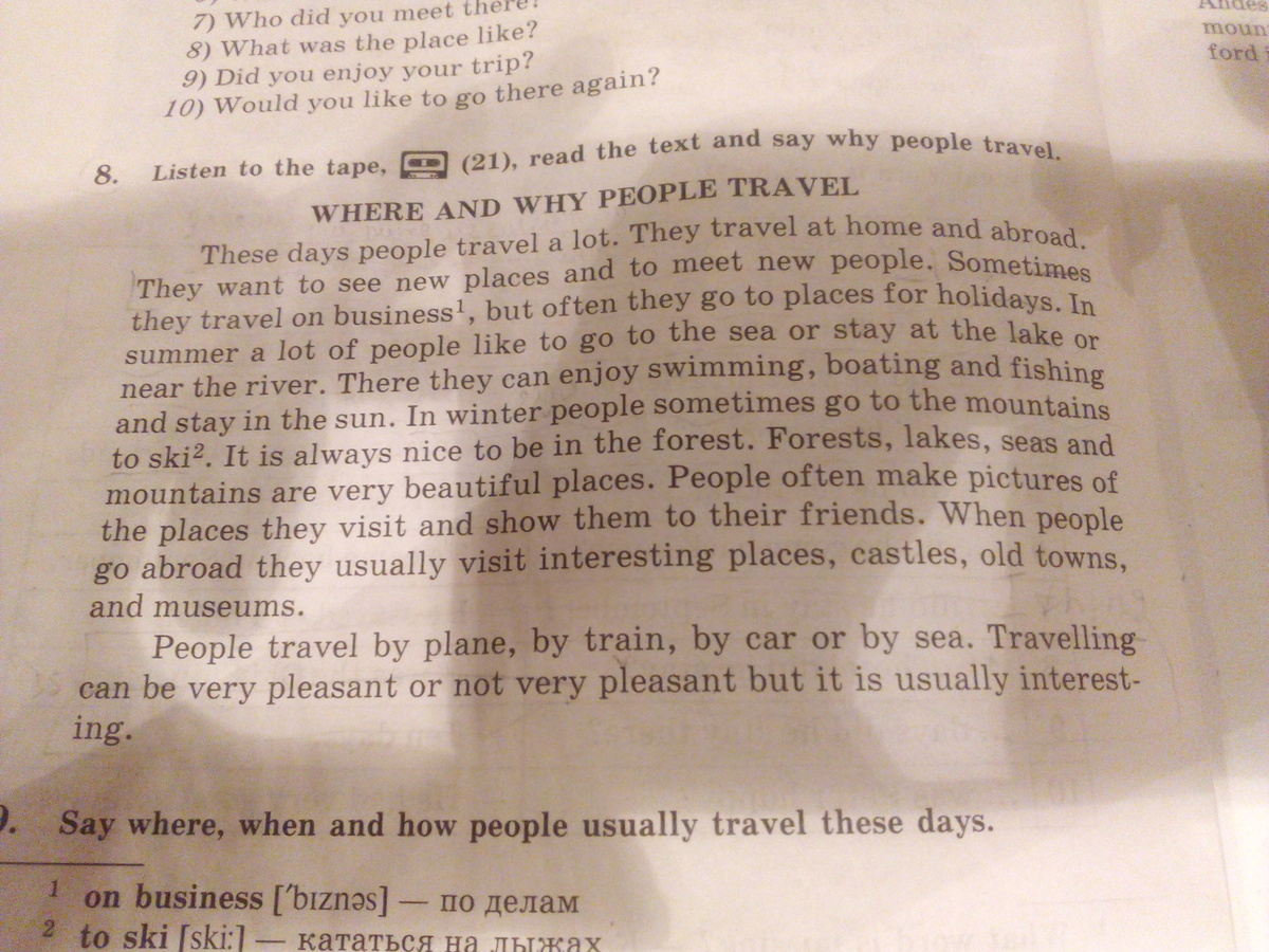 В эти дни люди много путешествуют. Они путешествуют дома или заграницей. Они хотят увидеть новые места и встретить новых людей. Иногда они путешествуют по делам, но чаще они ездил в другие места на каникулы. Летом многим людям нравится ездить на море или оставаться на озере или около реки. Здесь они могут наслаждаться плаванием, кататься на лодке и рыбачить и оставаться на солнце. Зимой люди иногда ездиет в горы, чтобы кататься на лыжах. Это всегда прекрасно быть в лесу. Леса, озера, моря и горы очень красивые места. Люди часто фотографируют места, которые они посещают и показывают их своим друзьям. Когда люди ездиют заграницу, они обычно посещают интересные места,замки, старые города и музеи.