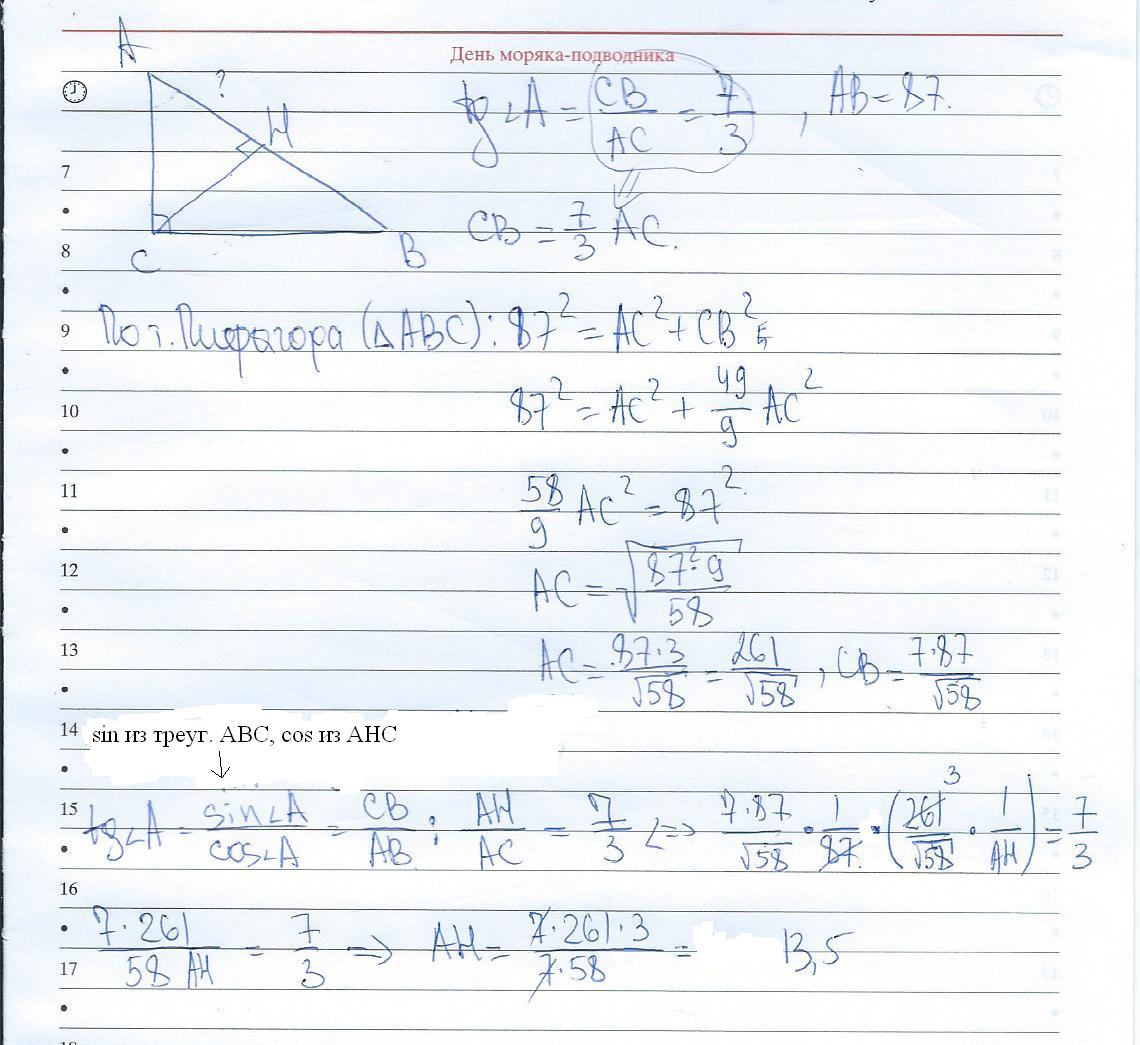 ПОМОГИТЕ РЕШИТЬ ЗАДАЧУ . В треугольнике ABC угол C равен 90° , CH — высота,AB= 87, tgA=7/3 . Найдите AH.