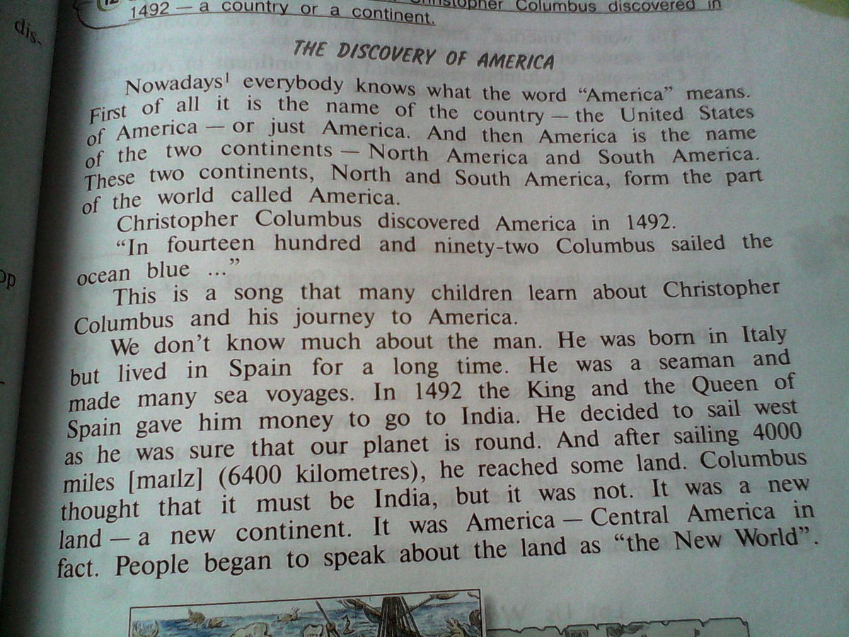 Мы многого не знаем о человеке. Он родился в Италии, но жил в Испании в течение долгого времени. Он был мореплавателем и совершил много морских путешествий. В 1942 король и королева Испании дали ему денег для поездки в Индию Он решил переплыть восток, так как он был уверен, что наша планета круглая. После того как он проплыл 4000 мили, он нашел некую землю. Колумб подумал, что это должна быть Индия, но это было не так. Это была новая земля – новый континент. На самом деле это была Америка. Люди начали говорить о новой земле, «Новый Мир»(Свет).