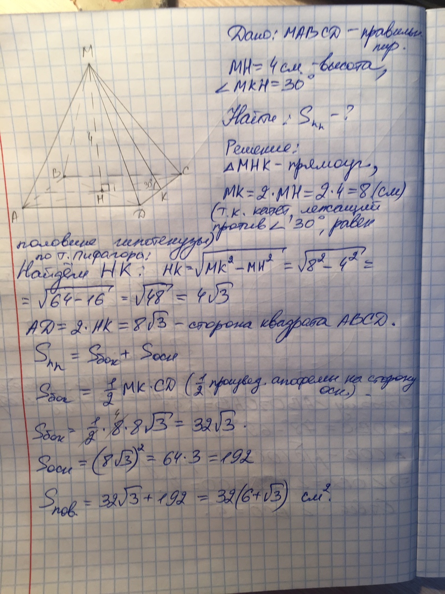 В правильной четырехугольной пирамиде МАВСД высота 4 см, апофема наклонена к плоскости основания под углом 30 градусов. Найдите площадь поверхности пирамиды.(решите пожалуйста подробно с рисунком)