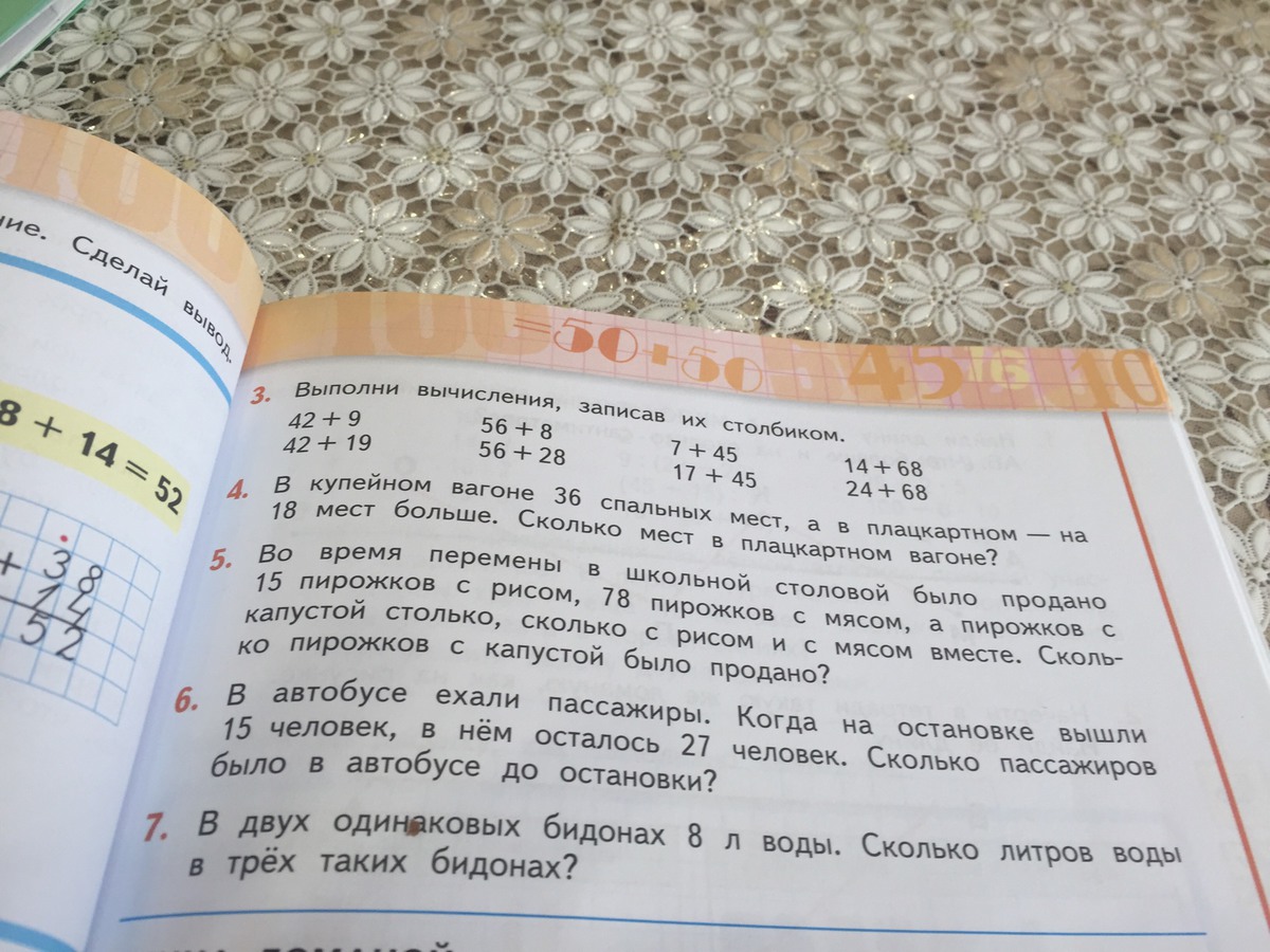 №4 36+18=54 места в плацкартном вагоне №5 15+78=93 пирожка с капустой №6 15+27=42 пассажира было всего №7 8:2=4 л воды в 1 бидоне 4*3=12 л воды в 3 бидонах