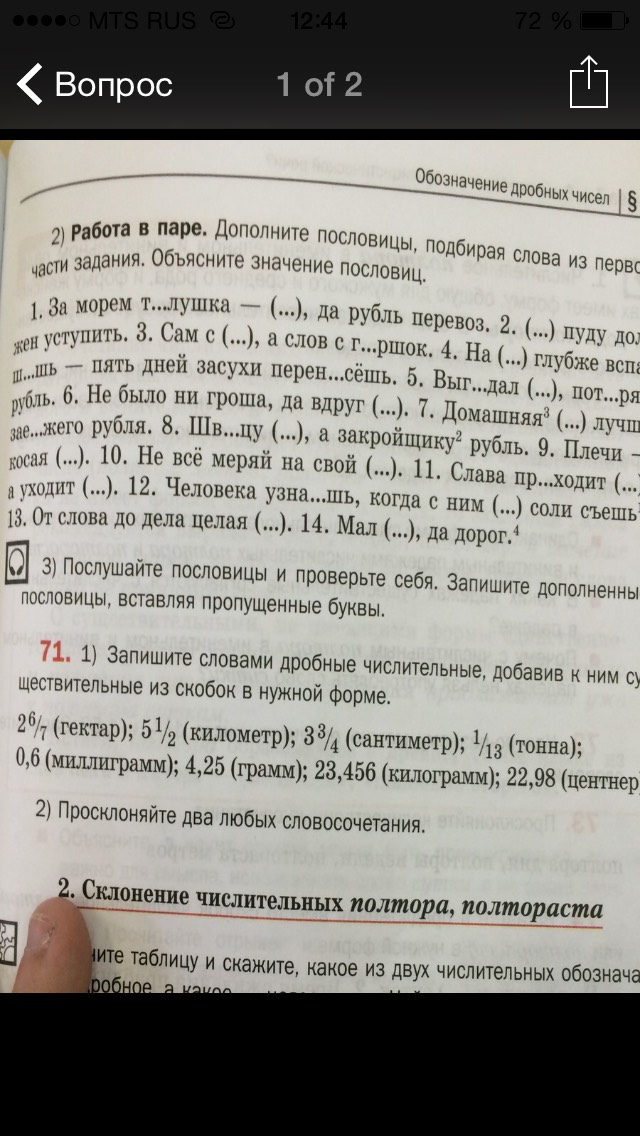 71:две целых,шесть седьмых гектара.пять целых,одна вторая километра.три целых,три четвертых сантиметра.одна тринадцатая тонны.ноль целых,шесть десятых миллиграмма.четыре целых,двадцать пять сотых грамма.двадцать три целых,четыреста пятьдесят шесть тысячных килограмма.двадцать две целых,девяносто восемь сотых центнера.