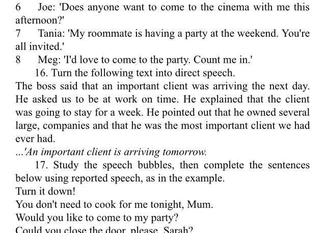 The boss said that an important client was arriving the next day. He asked us to be at work on time. He explained that the client was going to stay for a week. He pointed out that he owned several large, companies and that he was the most important client we had ever had.