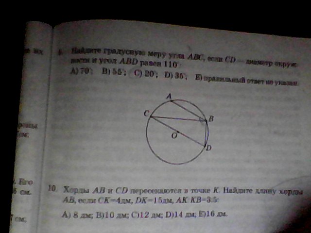 Найдите градусную меру угла ABC, если CD- диаметр окружности и угол ABD равен 110 градусов,