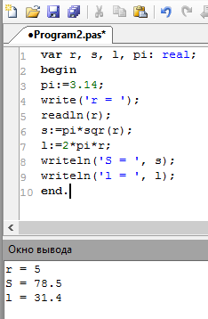 Написать программу нахождения площади круга и длины окружности радиуса в паскале.