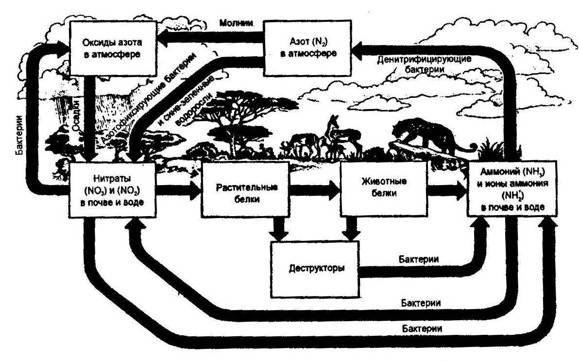 Круговорот начинается с фиксации атмосферного азота азотфиксирующими бактериями и сине-зелёными водорослями,в результате чего образуются нитраты,способные поглощаться растениями из почвы и воды. Превращение атмосферного азота возможно также и за счёт электрических разрядов,к примеру,во время грозы. Нитраты поглощаются растениями,которые после отмирания разлагаются гнилостными бактериями до аммиака,то же самое происходит и с животными,поедающими растения,а также с продуктами их жизнедеятельности,к примеру,мочевиной. Аммиак с помощью денитрифицирующих бактерий снова переходит в атмосферный азот,это же может произойти и с нитратами в воде и почве.