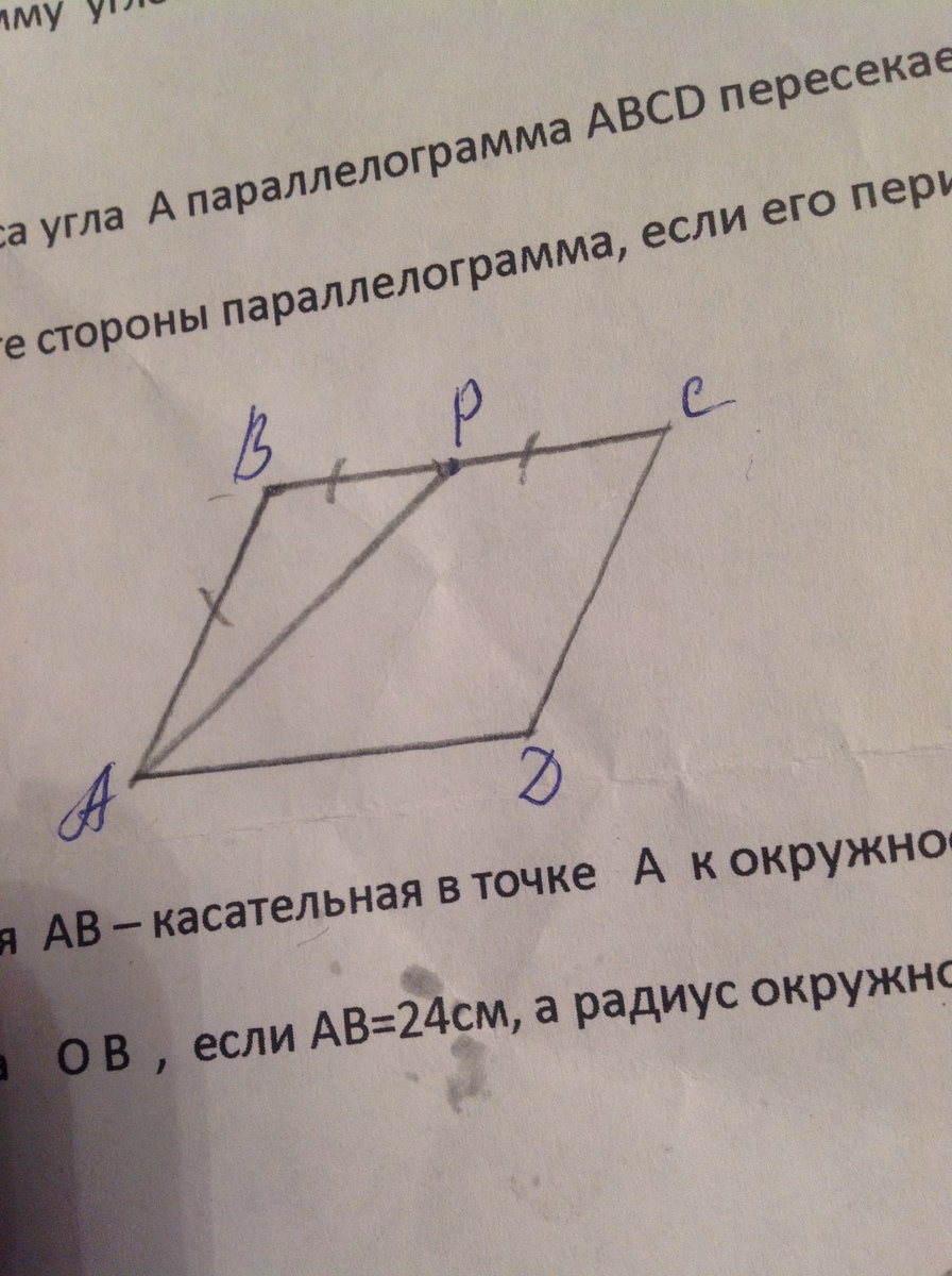 Биссектриса угла А параллелограмма АВСД пересекает сторону ВС в точке Р,причем ВР=РС.Найдите стороны параллелограмма,если его периметр равен 60 см ФОТО ВНУТРИ