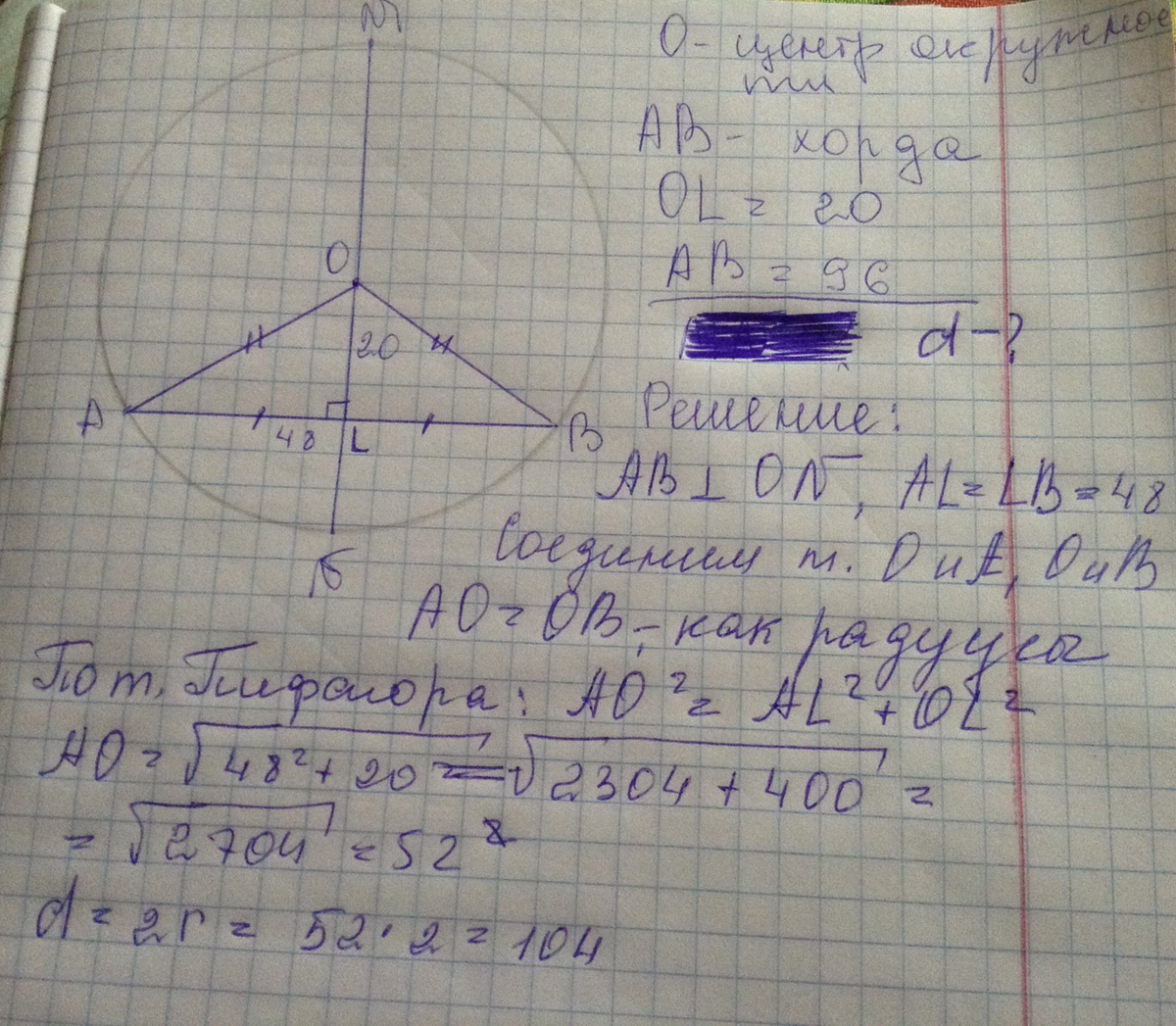 Длина хорды окружности равна 96 а расстояние от центра окружности до этой хорды равно 20 найдите диаметр окружности. Пожулуйсто дайте еще формулу