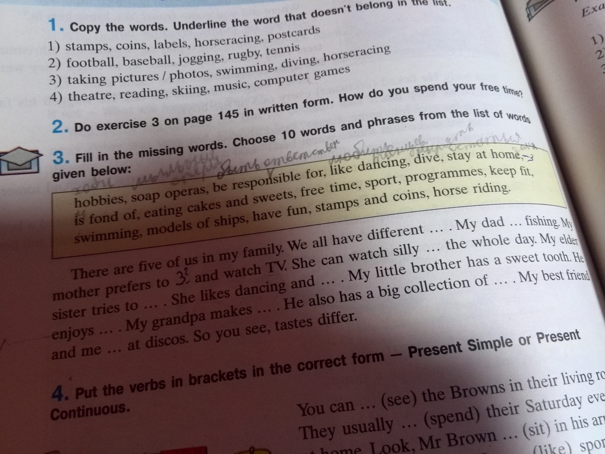 There are five of us in my familly. We all have different hobbies. My dad is fond of fishing. My mother prefers to stay at home and watch TV. She can watch silly soap operas the whole day. My elder sister tries to sport. She likes dancing and swimming. My little brother has a sweet tooth. He enjoys eating cakes and sweets. My grandpa makes models of ships. He also has a big collection of stamps and coins. My best friend and me like dancing at discos. So you tastes differ.