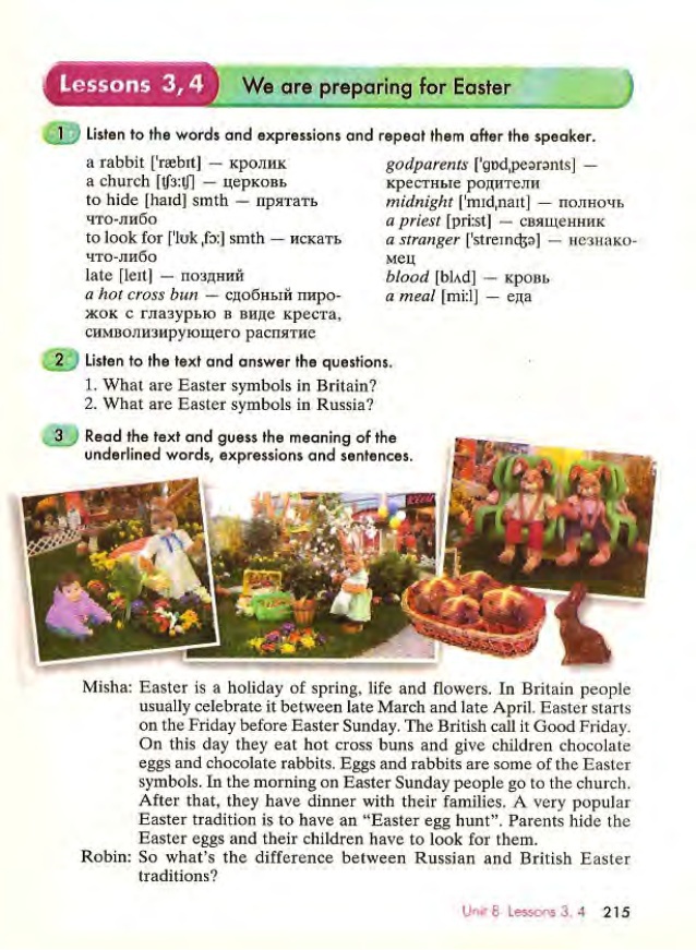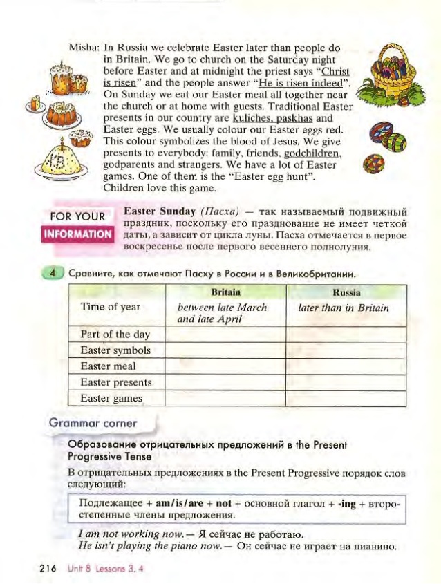 Миша: В России Пасха празднуется позже, чем в Англии. Мы ходим в церковь в субботнюю ночь перед Пасхой и в полночь священник говорит: "Христос Воскрес" и люди отвечают "Воистину воскрес". В воскресенье мы кушаем нашу пасхальную еду около церкви или дома с гостями. Традиционные пасхальные подарки в нашей стране - это куличи, пасхи и пасхальные яйца. Обычно мы красим пасхальные яйца в красный. Этот цвет символизирует кровь Иисуса Христа. Каждому мы дарим подарки: членам семьи, друзьям, крестникам. крестным, незнакомым. У нас множество пасхальным игр. Одна из них - это "Охота за пасхальным яйцом". Дети любят эту игру.
