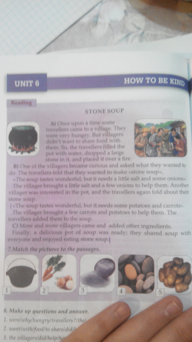Однажды путешественники пришли в деревню. Они были очень голодны. Но деревенские люди не хотели делиться едой с ними.Поэтому путешественники наполнили горшок водой, бросили туда камень и поставили горшок на огонь.