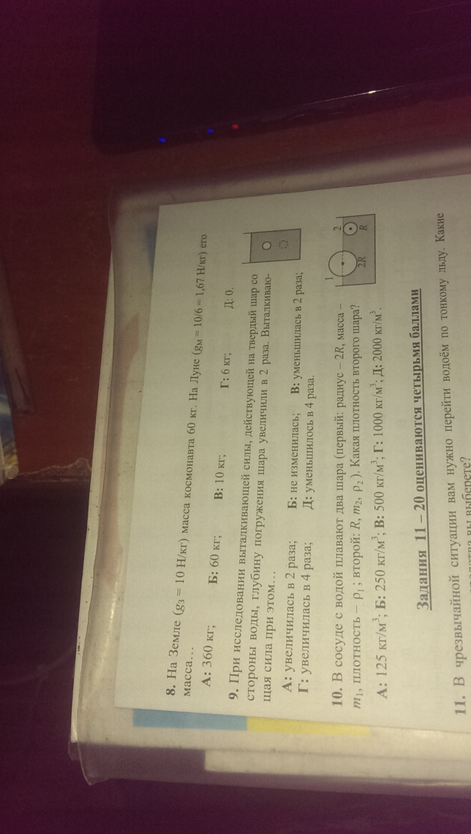 Ответы: № 8 - Б (масса не меняется, меняется его вес или сила тяжести); № 9 - Б; № 10 - Г.