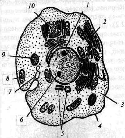 3-цитоплазма с целым комплексом специализированных структур — органоидов (эндоплазматическая сеть, рибосомы, митохондрии и пластиды, комплекс Гольджи и лизосомы, клеточный центр),
