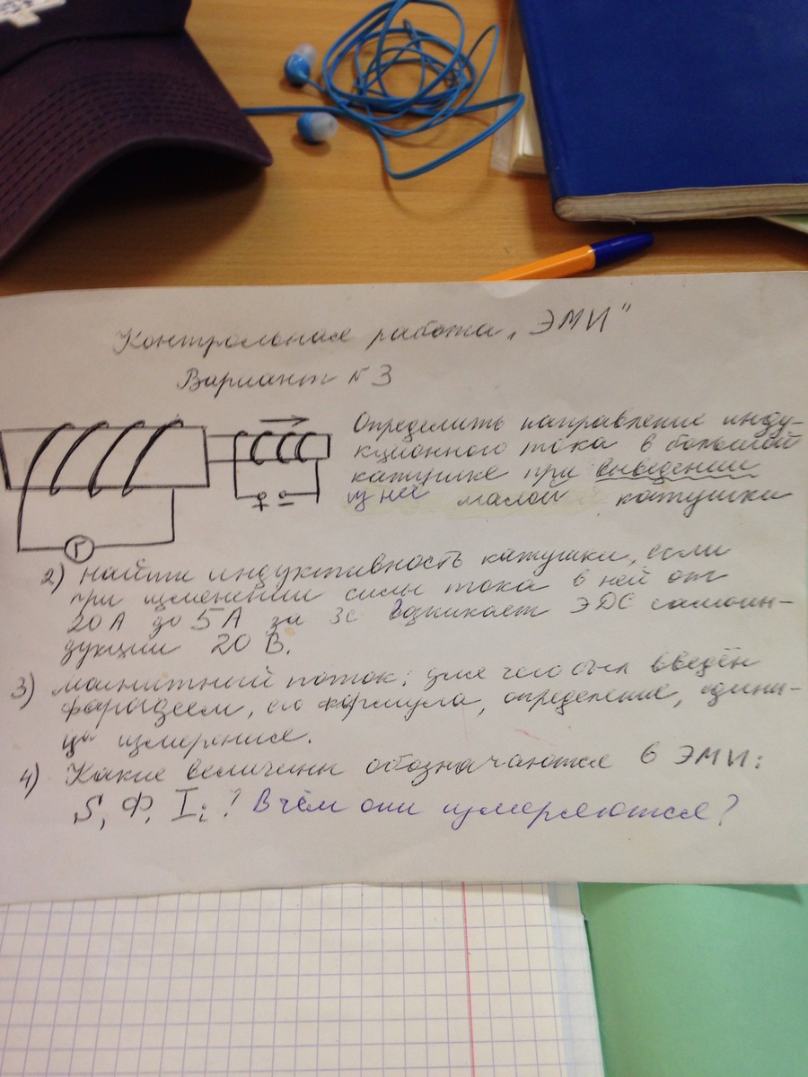 1) В большой катушке ток будет направлен по виткам сверху вниз. 2) L=? I1=20A; I2=5A; t=3c; E=20B. Решение: E= - L·Δt/ΔI ⇒L=E·Δt/ΔI = 20·3/(5-20)= 4 Гн 3) Поток магнитной индукции характеризует распределение магнитного поля по поверхности, ограниченной замкнутым контуром. Магнитным потоком Ф (потоком магнитной индукции) через поверхность площадью S называют величину, равную произведению модуля вектора магнитной индукции В на площадь S и косинус угла α между векторами В и n (нормалью): Ф=В·S·cos α = B·S. 4) S - площадь контура, который пересекает магнитный поток, измеряется в м²; Ф - магнитный поток, Вб (вебер); I - ток, А (ампер)