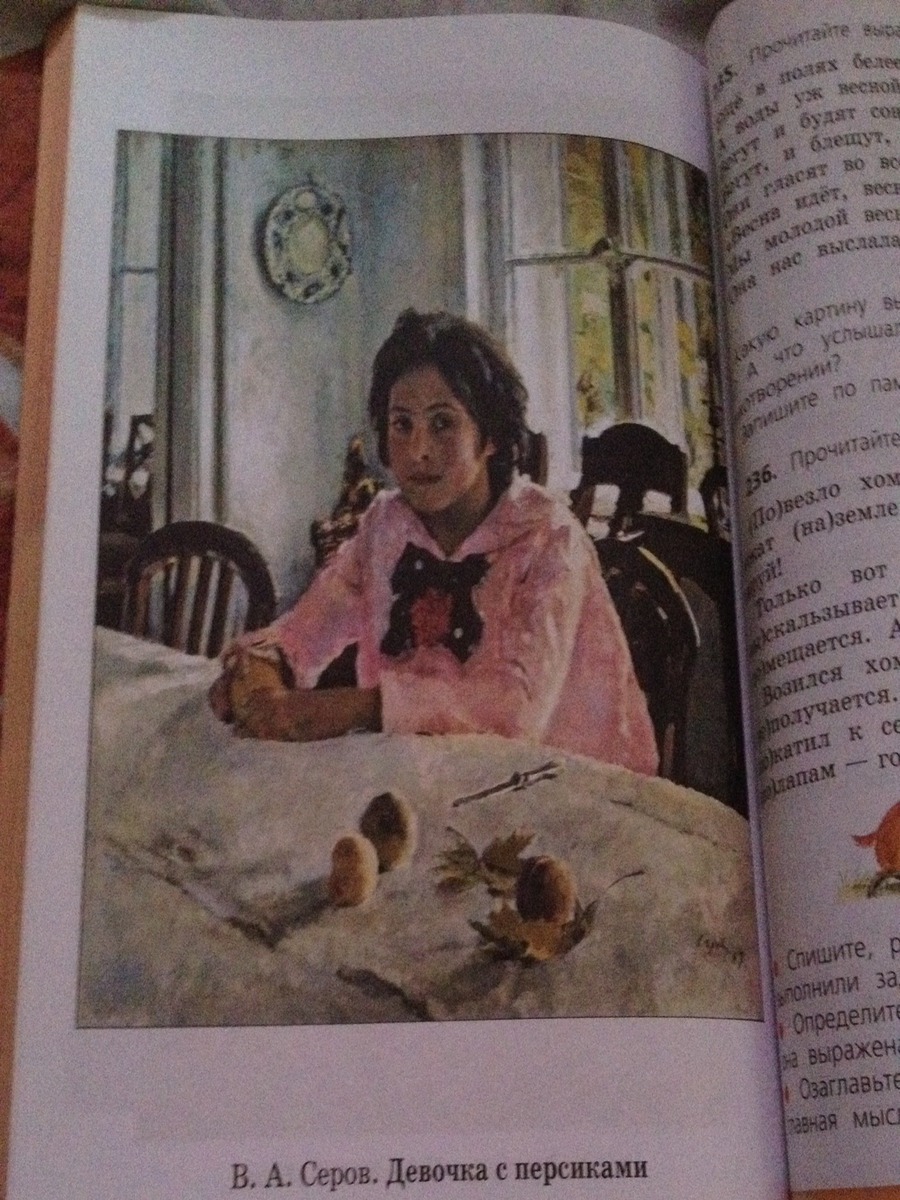 Перед нами картина Валентина А.С. под названием "Девочка с персиками" на переднем плане мы видим красивую девочку она имеет густые черные волосы у девочки смуглое личико румянец украшает её внешность и сочетается с розовой кофточкой и смугло розовыми персиками белоснежная скатерть красиво смотрится с черным бантом в белый горошек все это украшает старинная мебель в просторной комнате а листья клена оживляют картину
