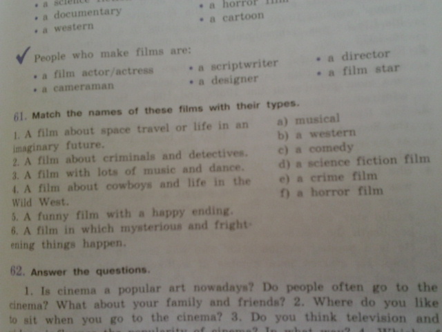 61. Задание. Соотнести названия жанров кино с их характеристикой. 1 - d. 2- e, 3 - a, 4 - b, 5 - c, 6 - f.
