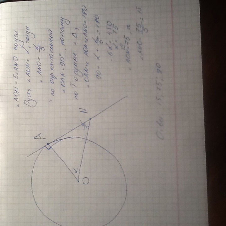 Через точку A к окружности с центром O проведена касательная AN найти углы треугольника AON если угол AON больше угла ANO в пять раз.